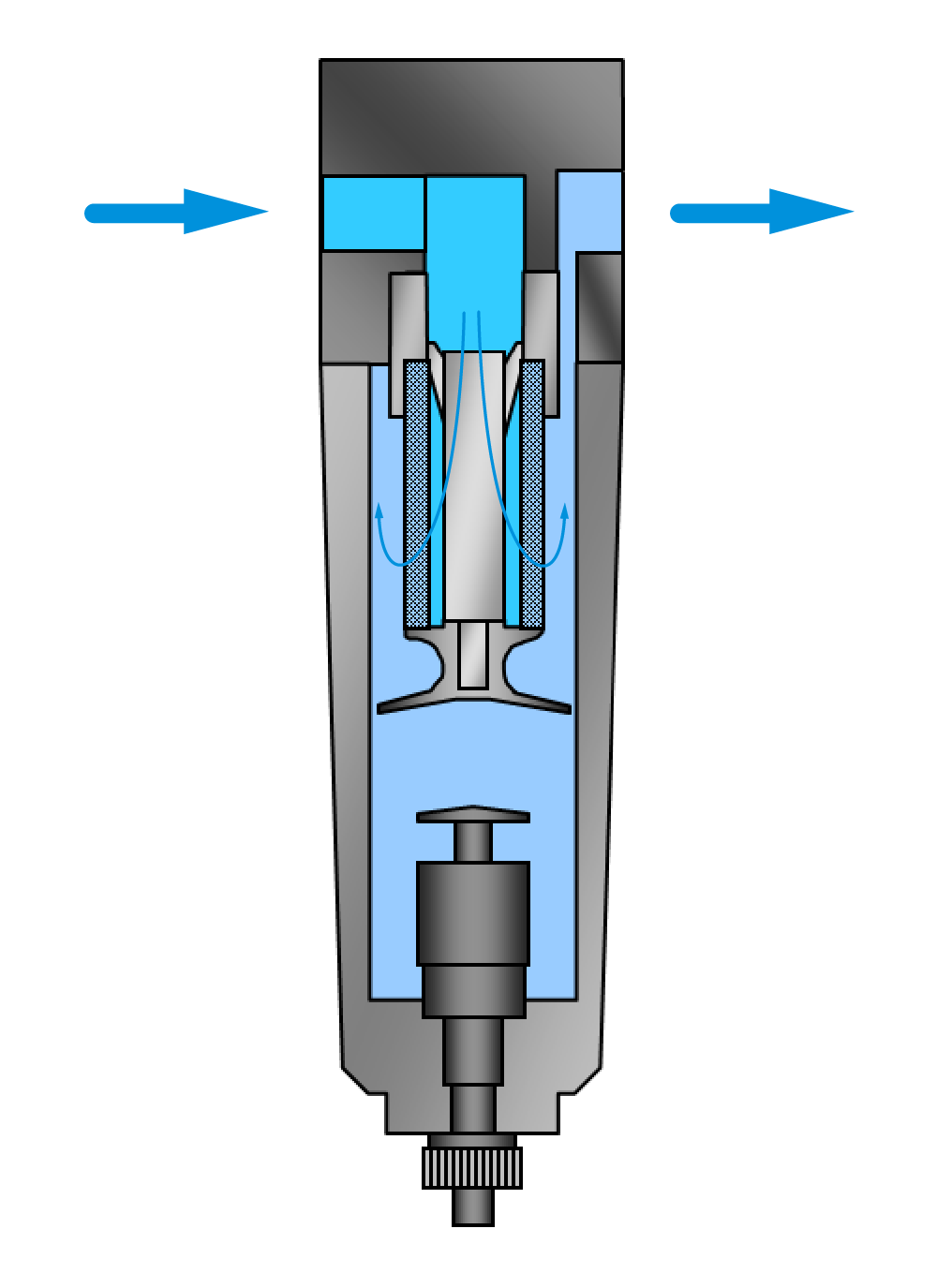 Die Fein- und Feinstfilter innerhalb der Wartungsgeräte-Baureihen und auch als Einzelgeräte sind Mikrofilter. Sie haben jedoch einen ganz ähnlichen Aufbau wie die oben beschriebenen – mit zwei Unterschieden: es gibt keinen Wirbeleinsatz