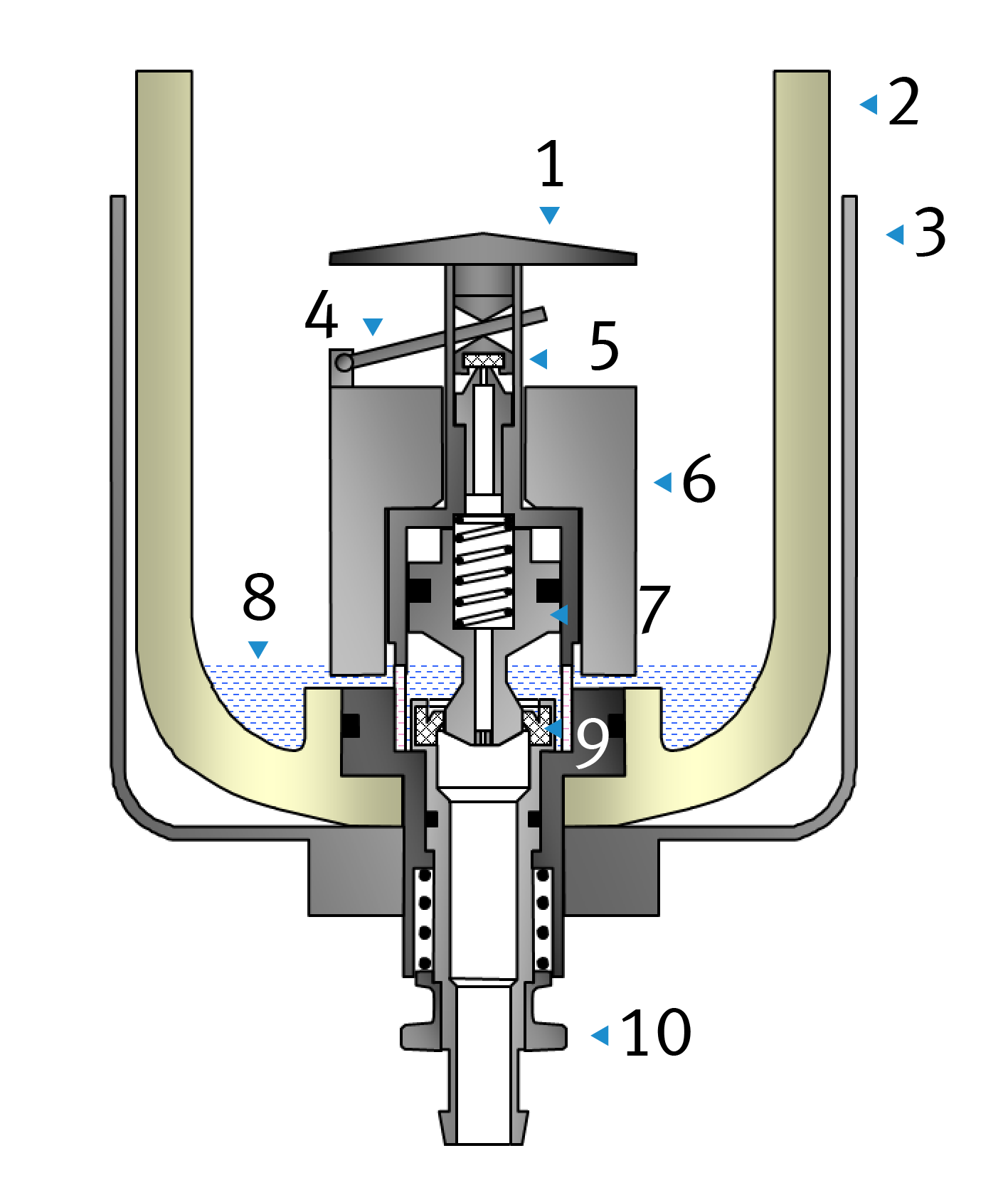 An der Darstellung ist bereits zu erkennen, dass einerseits immer eine geringe Restmenge an Kondensat | 8 | in der Schale verbleibt. Andererseits ist eine Mindestmenge an Kondensat erforderlich, um den Ablass in Funktion zu bringen.