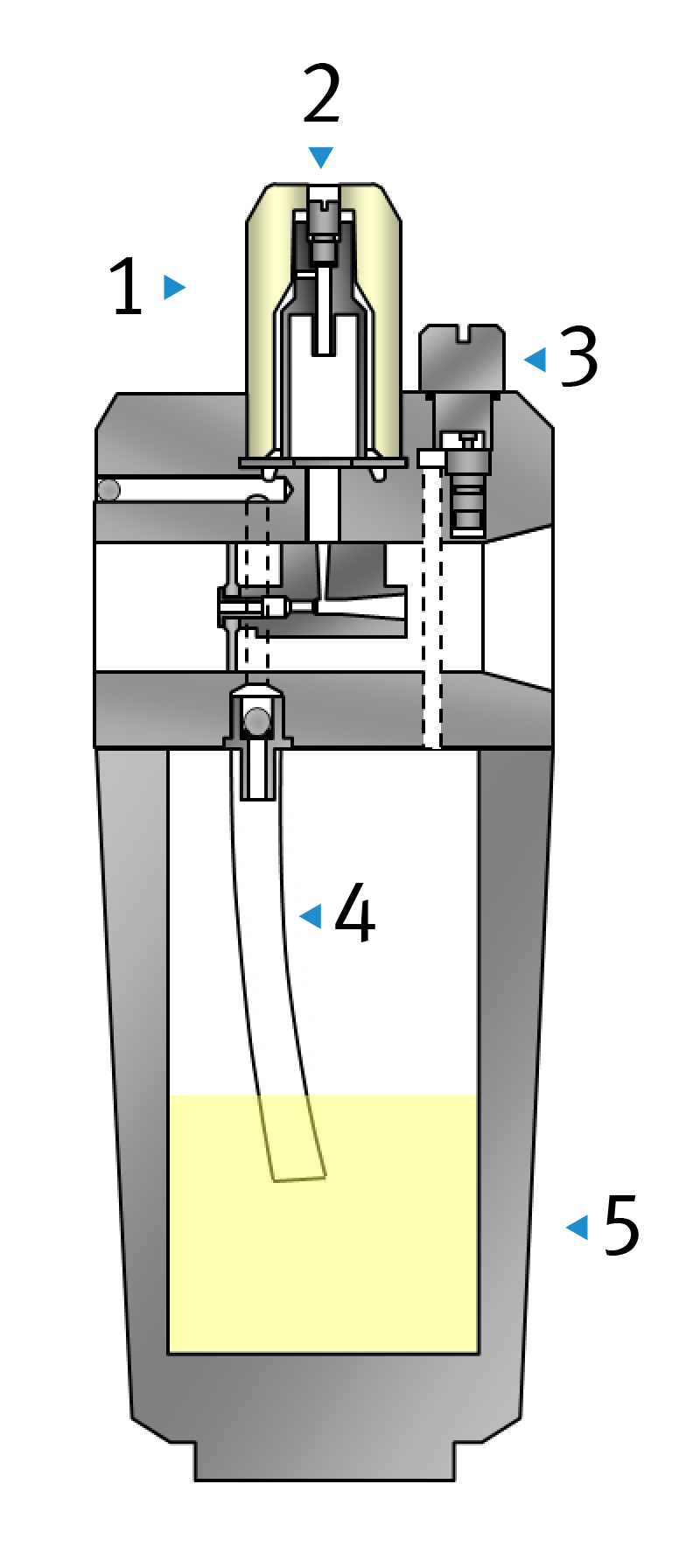 Zum Nachfüllen des Öls ist es notwendig, das unter Druck stehende Öl-Reservoir | 5 | zu entlüften. Dazu befindet sich am Öler ein spezielles Ventil | 3 |, das beim Öffnen automatisch entlüftet (unterschiedliche Ausführung bei den Reihen).