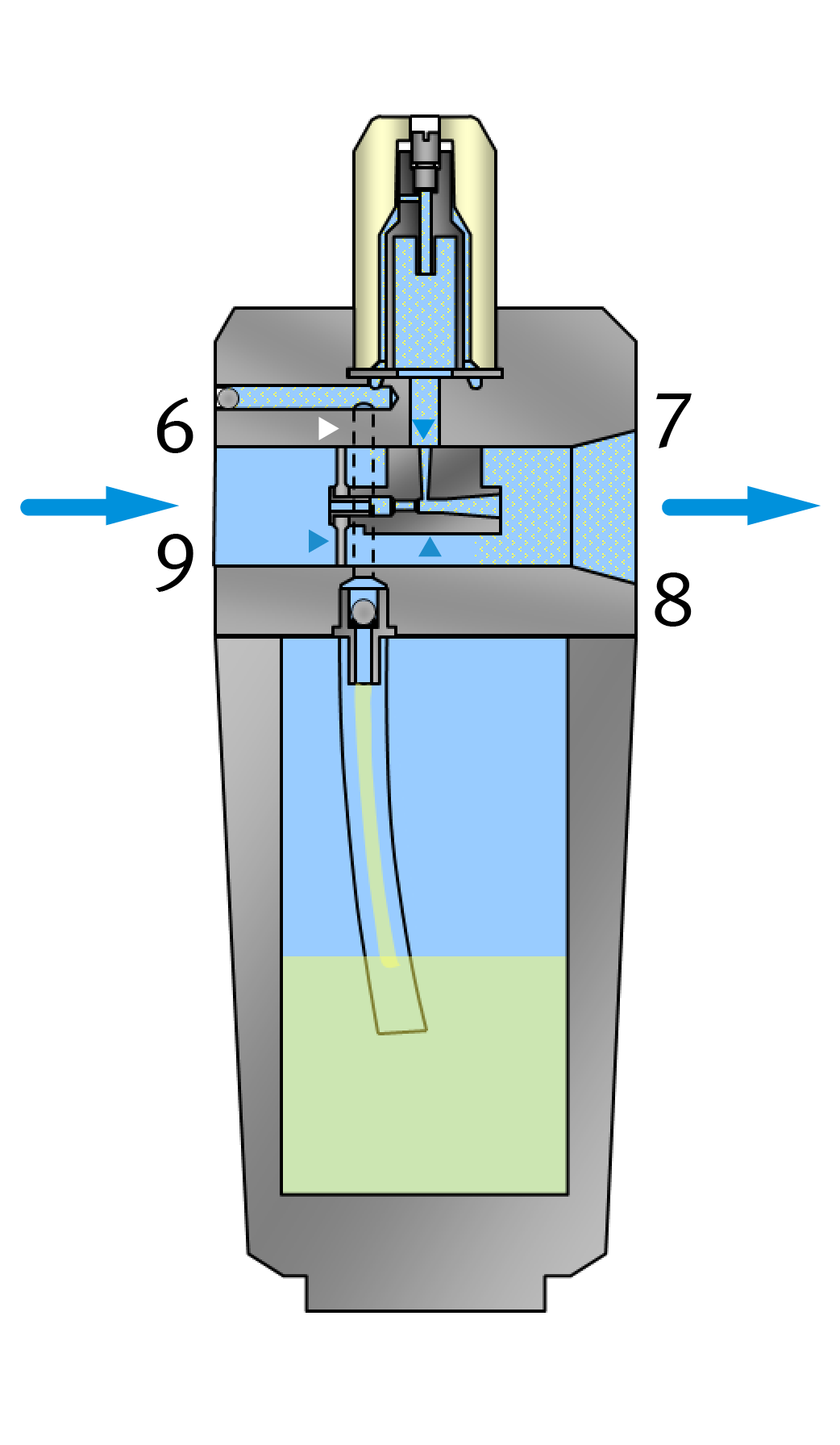 Tropfenweise gelangt es dann in den Ansaugkanal | 7 | der Venturidüse | 8 |, die für die feine Zerstäubung in die Druckluft sorgt.