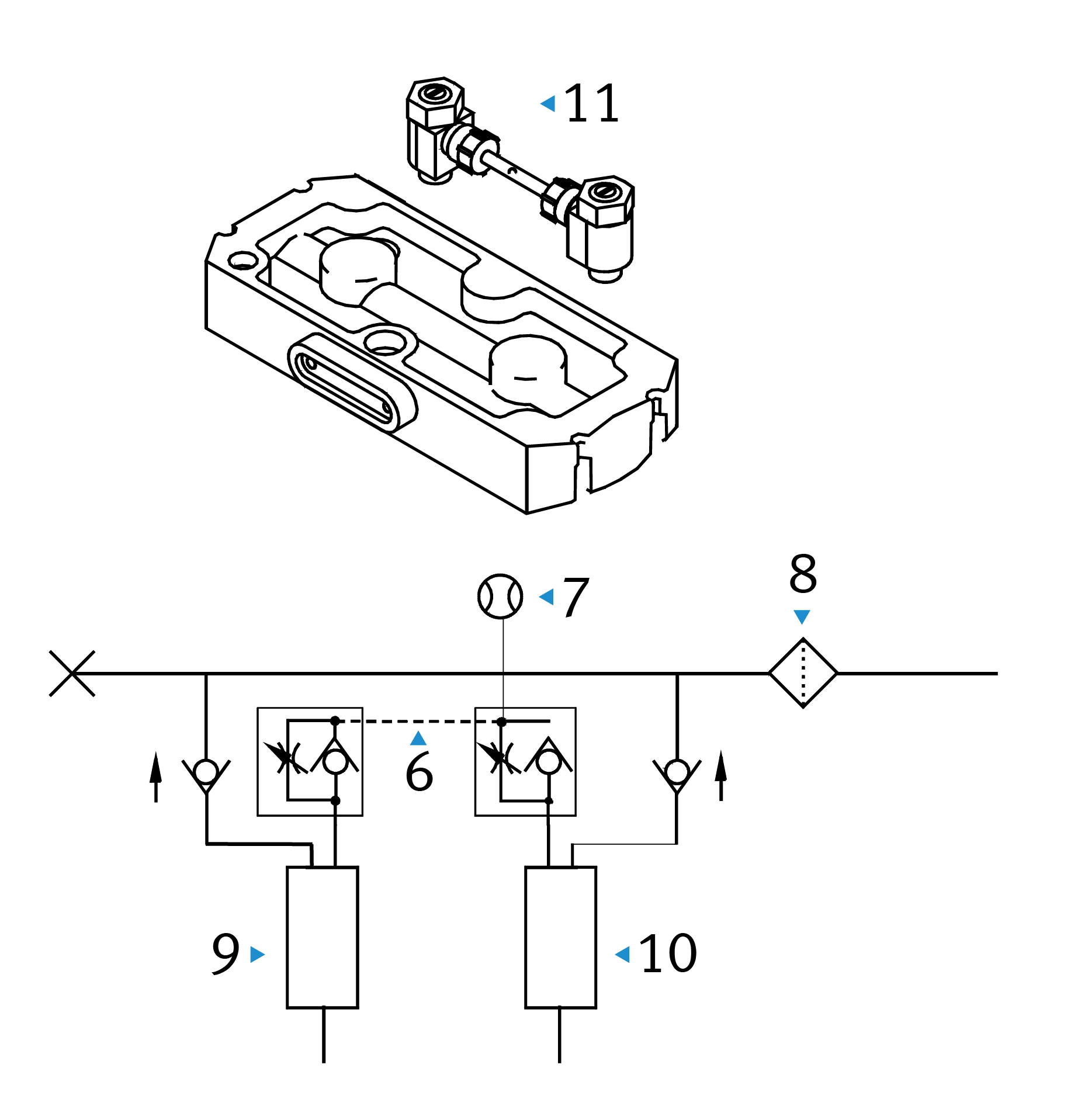 An der Oberseite befinden sich dazu zwei Drosselrückschlagventile | 11 |. Nach dem Herausnehmen des Verbindungsschlauches | 6 | und dem Anschließen eines Durchflussmessgeräts, ist der Durchfluss für diese Granulat-Trockungsluft an den Ventilen | 7 |