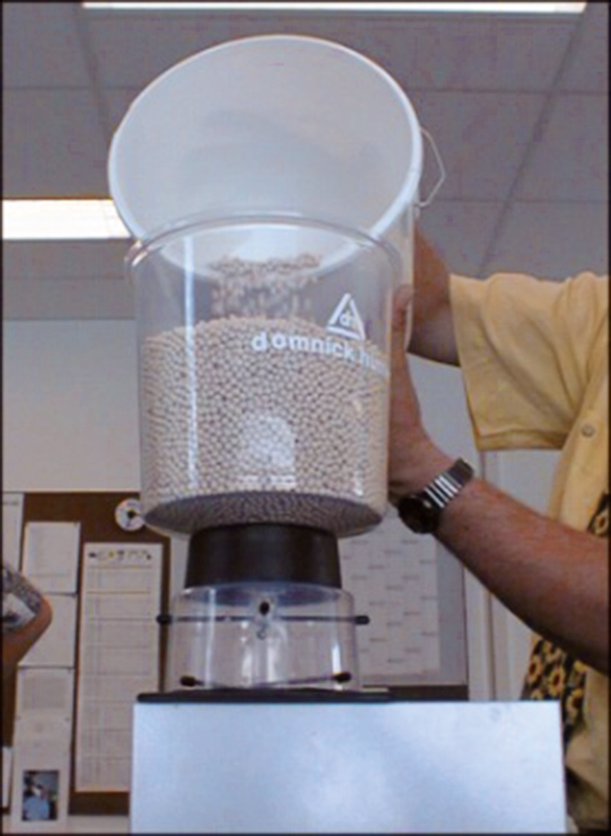 Beim Befüllen fällt das Granulat durch zwei fadenkreuzartige Stabkombinationen und wird