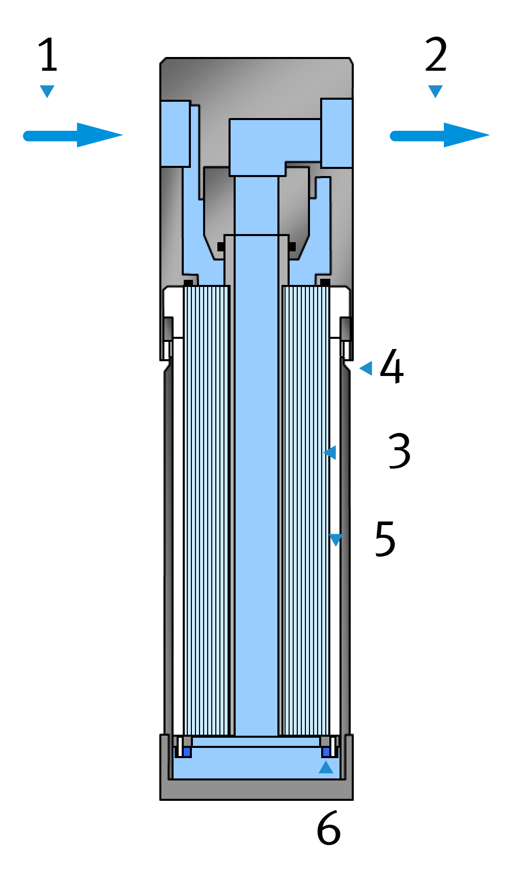 Zunächst wird die zuströmende Druckluft im Oberteil des Trockners so verteilt, dass sie von oben durch die Trocknungsmembran | 3 | strömt.