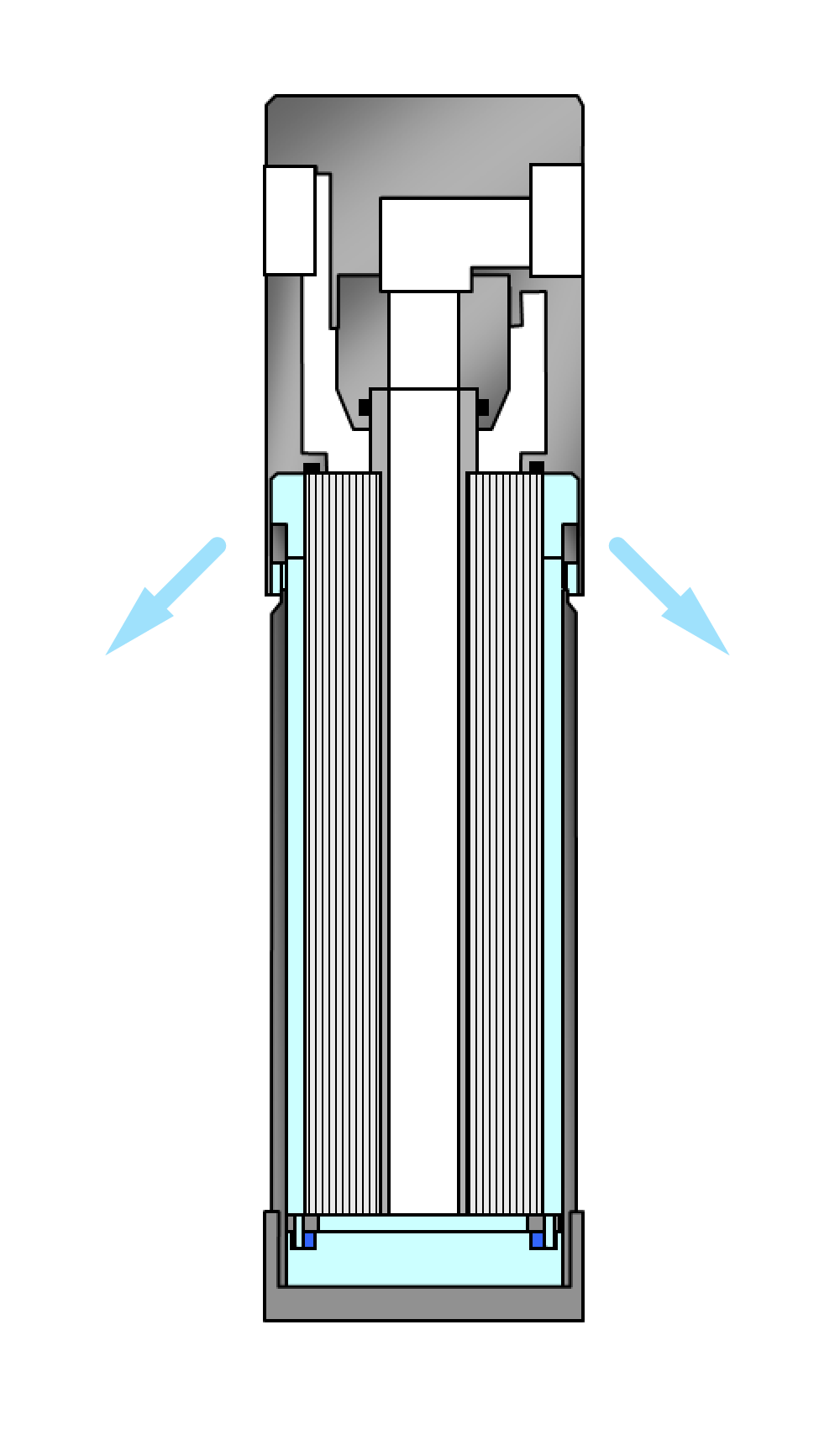 und wird nun durch die große Öffnung in der Mitte der Membrane wieder nach oben geleitet und verlässt hier den Trockner durch den Arbeitsanschluss | 2 |.