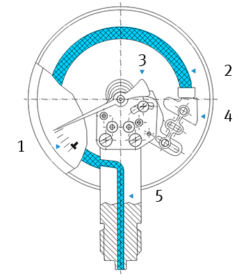 Die dabei entstehenden Spannungen biegen die Feder auf. Das nicht eingespannte Federende führt nun eine Bewegung aus, die ein Maß für den Druck ist. Über eine Mechanik wird diese Bewegung zur Anzeige gebracht. Die kreisförmigen,