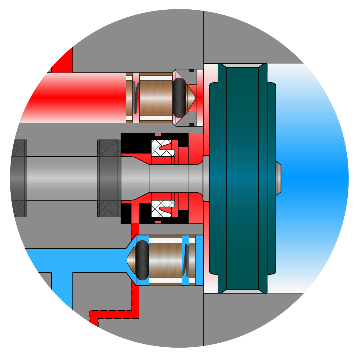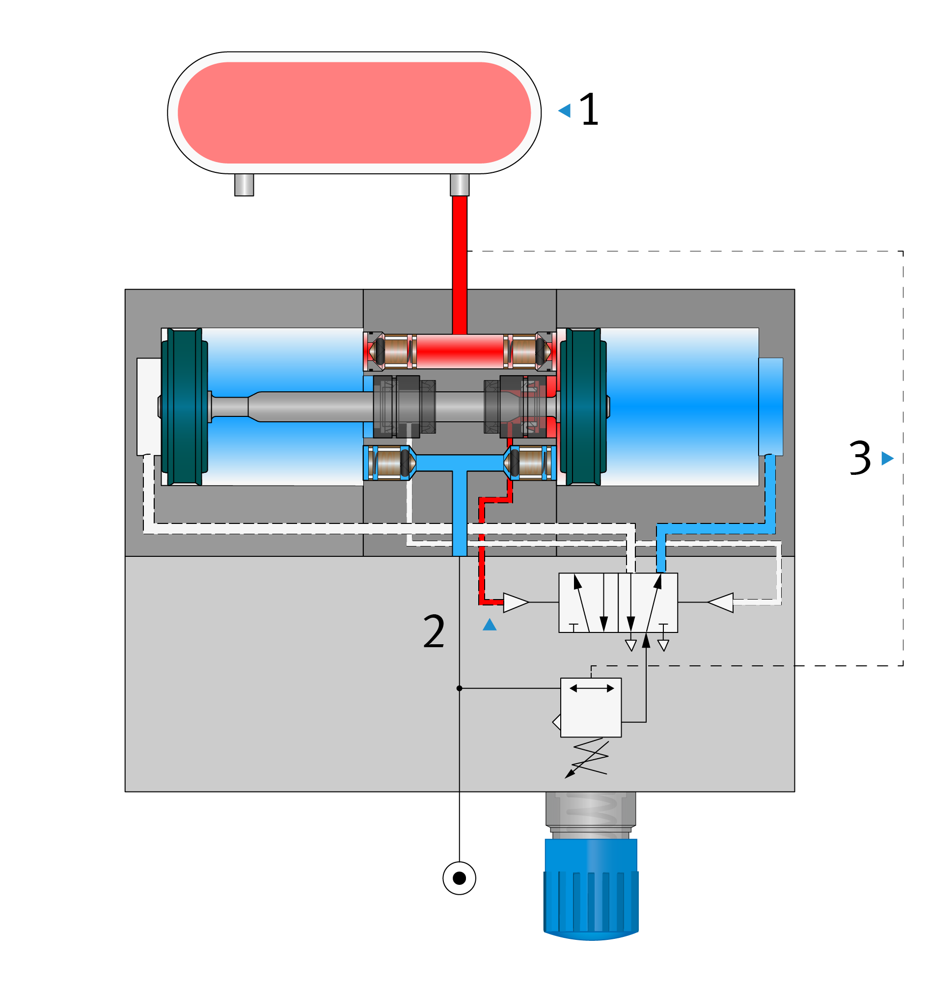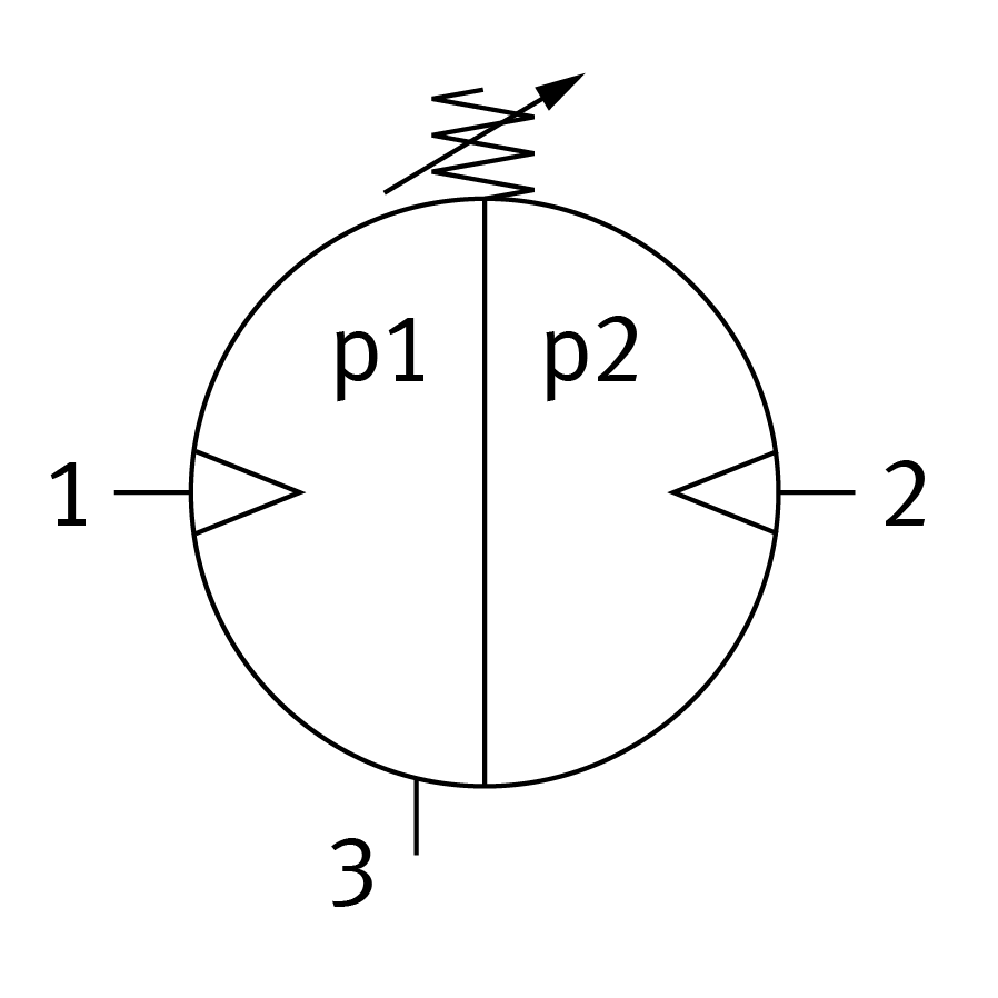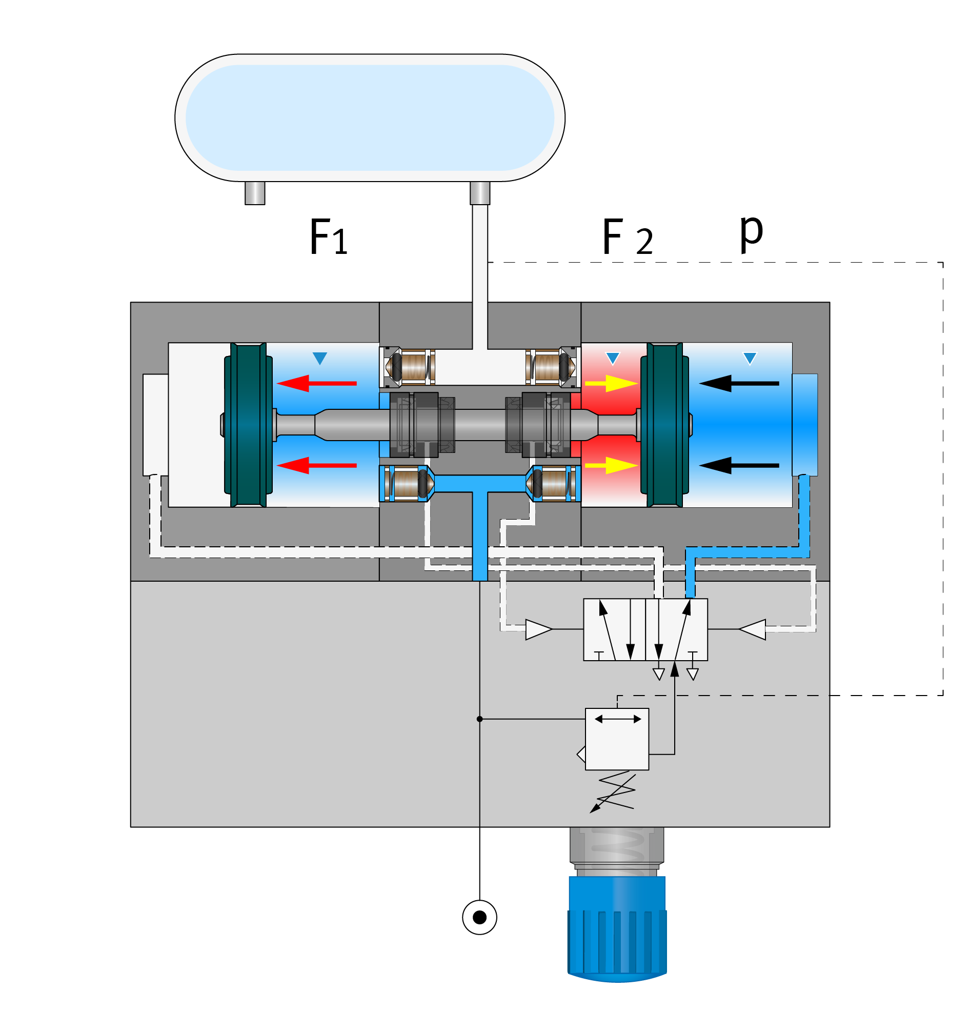 In der Abbildung wirken zunächst die Kolbenkräfte F1 und F2 durch den Betriebsdruck. Da ihr Betrag gleich, ihre Wirkungsrichtung aber entgegengesetzt ist, heben sie sich gegenseitig auf. Zusätzlich liegt aber der Ausgangsdruck des Reglers
