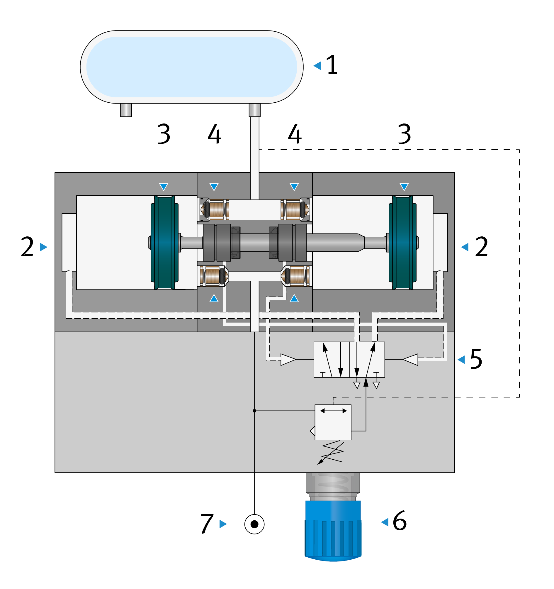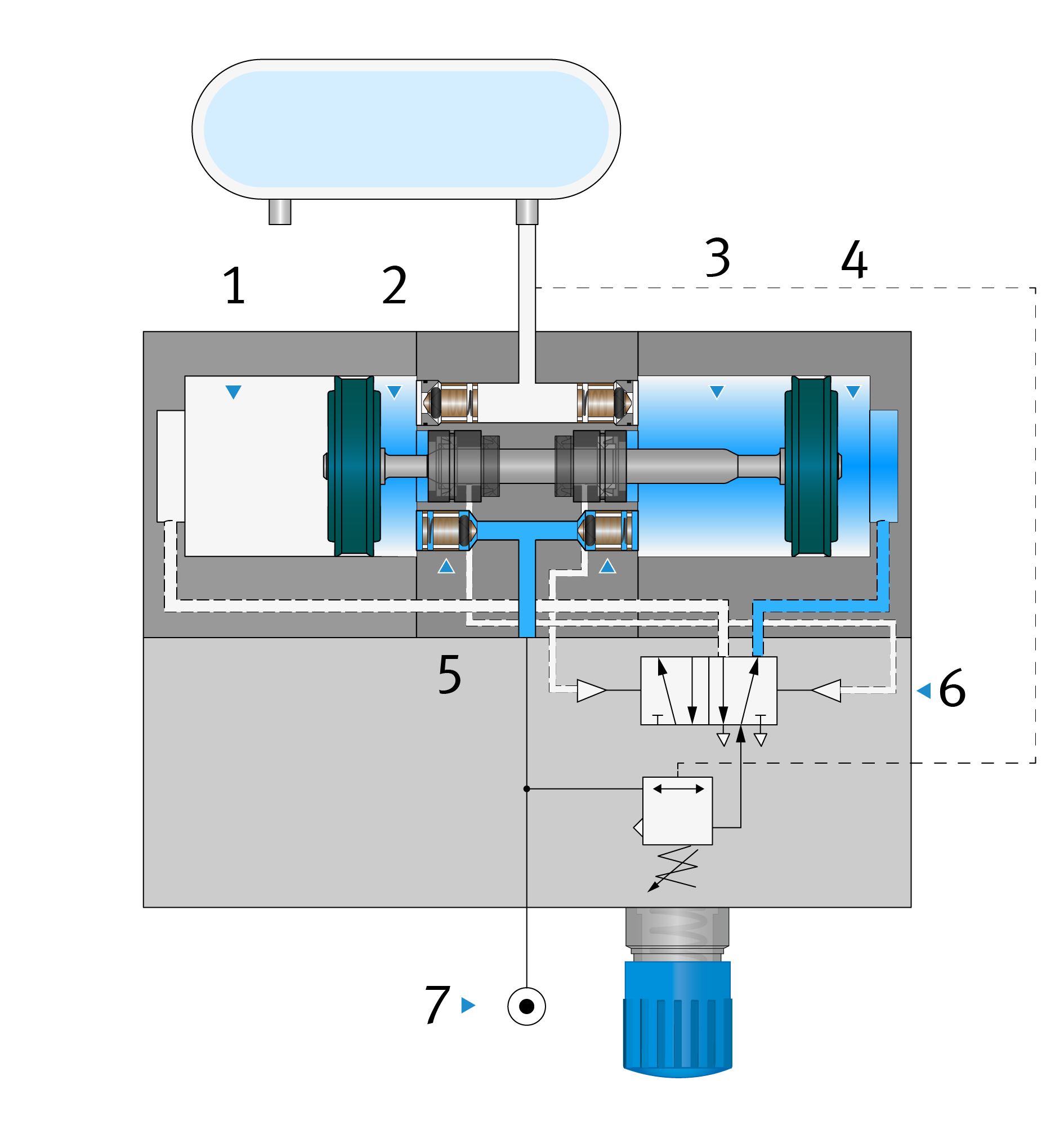 Der Betriebsdruck | 7 | belüftet über zwei Rückschlagventile | 5 | die Volumina 1 | 3 | und 4 | 2 | direkt und permanent.