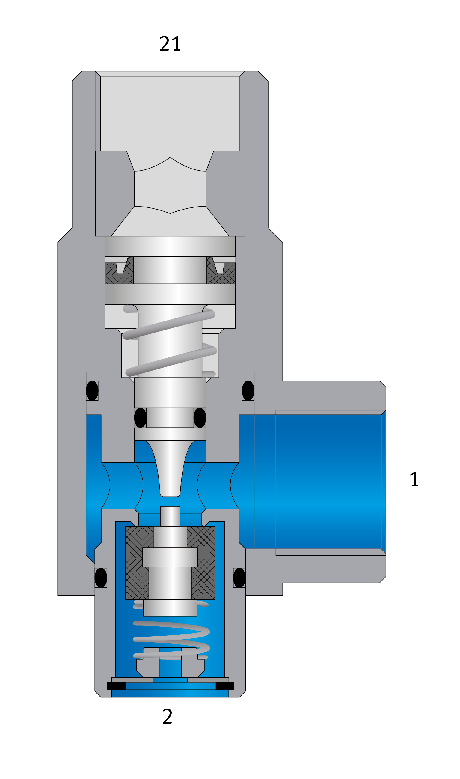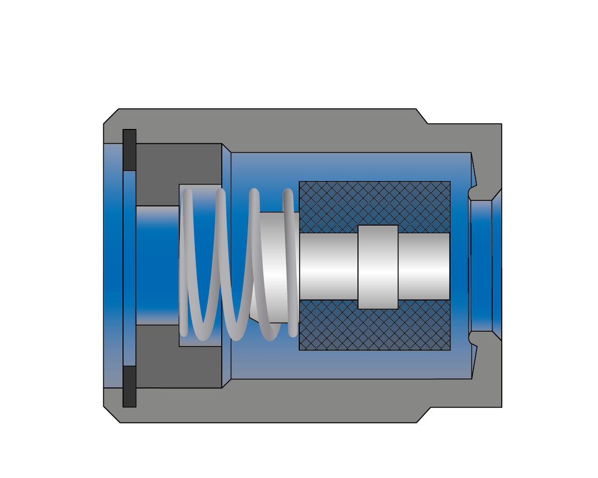 Während bei den Rückschlagventilen ohne Federbelastung der Druck in Durchlassrichtung nur geringfügig größer sein muss als in Sperrrichtung, muss hier zusätzlich die Andrückkraft einer Feder überwunden werden.