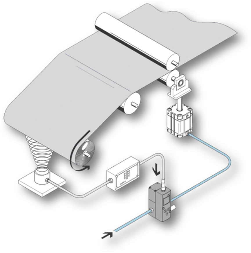 Die Abbildung zeigt das Prinzip einer Anwendung, bei der ein Proportionalventil benutzt wird, um die Spannkraft beim Abspulen von Stoffbahnen u.ä. konstantzuhalten.