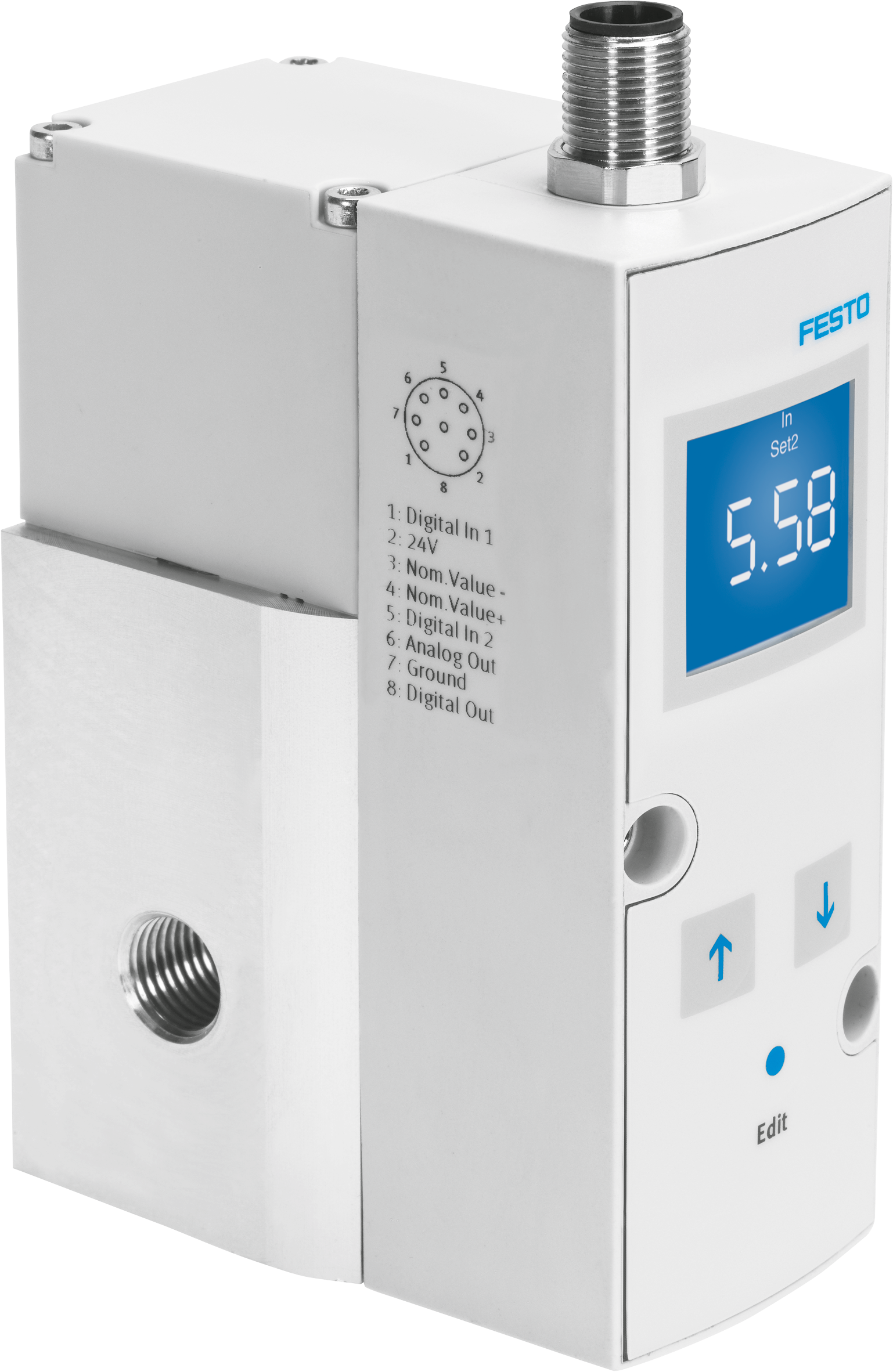 Als Sollwert für einen zu regelnden Druck wird am Anschluss des Steuerblocks entweder eine elektrische Gleichspannung z.B. 0-10 V oder ein Strom z.B. 0-20 mA; 4-20 mA angelegt.