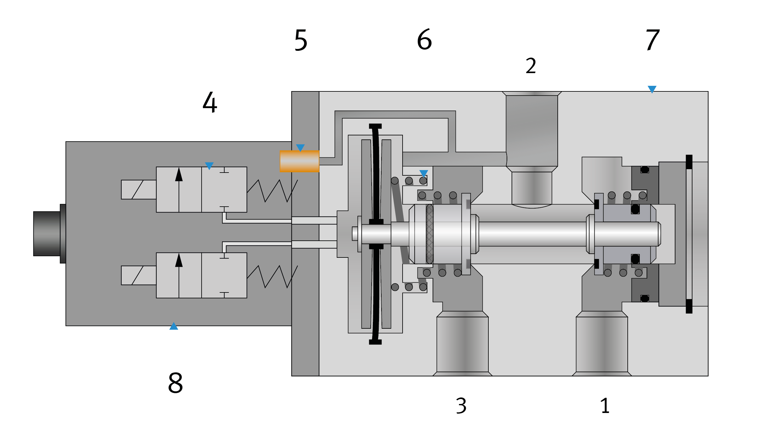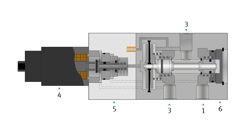 Die Vorsteuerung besteht aus einem kraftgesteuerten Proportionalmagneten und einem Ventil.