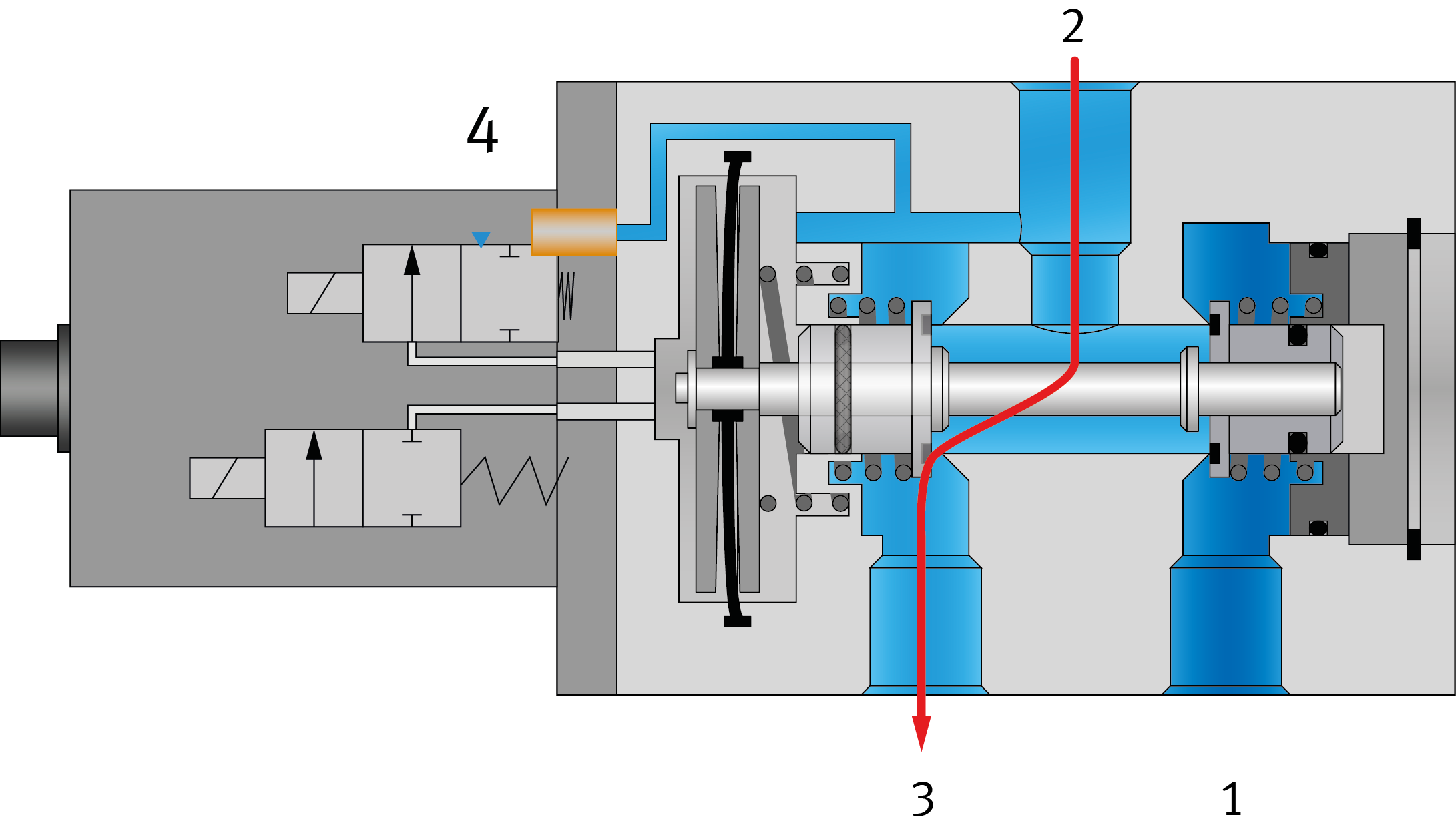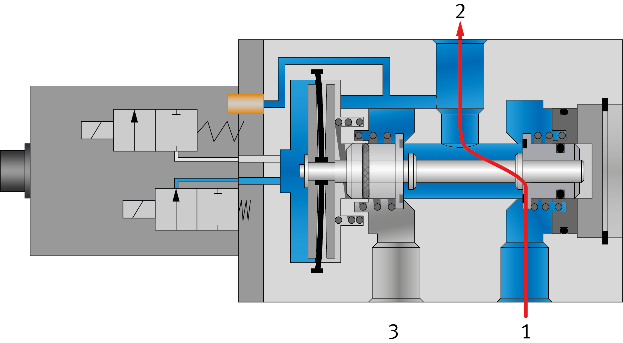 der linken Seite des Steuerkolbens. Dadurch bewegt sich der Steuerkolben nach links und die Verbindung zwischen den Kanälen 2 und 3 wird zum Entlüften freigeschaltet.