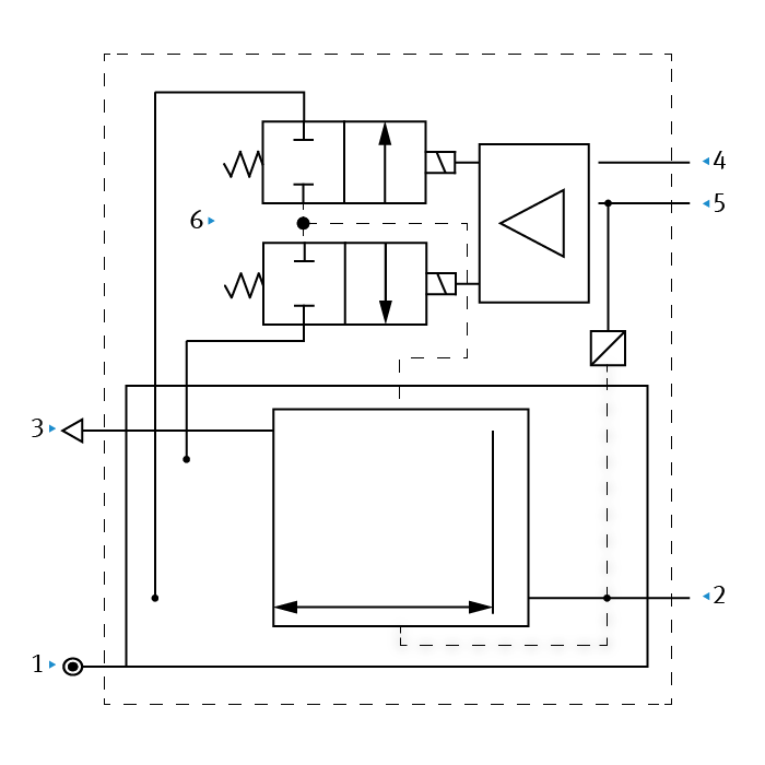 Im stromlosen Zustand sind die beiden Vorsteuerventile im Steuerblock geschlossen und der Steuerschieber im Booster wird von seinen Federn in Mittelstellung gebracht.