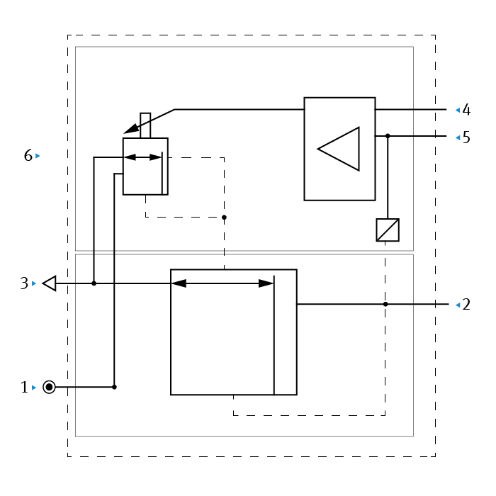 Der Istdruck am Anschluss 2 wird von dem integrierten Drucksensor gemessen und an die Elektronik weitergeleitet. Diese vergleicht nun den tatsächlichen Druck (Istwert) mit dem gewünschten Druck (Sollwert).