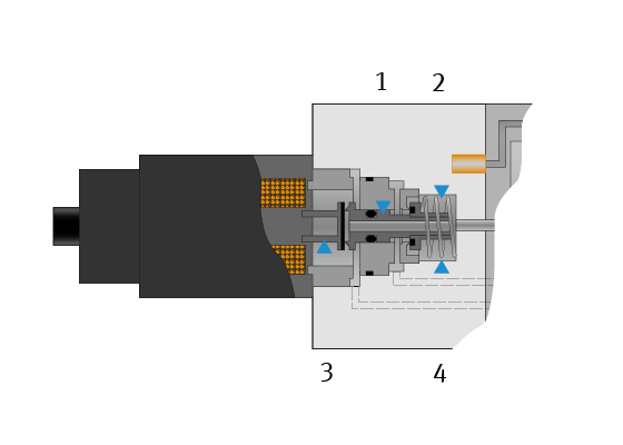 Der Proportionalmagnet erzeugt entsprechend dem Sollwert eine Kraft, mit der der Anker den Dichtungssitz verschließt. Die erzeugte Kraft des Proportionalmagneten auf der einen Seite, die Kraft der Rückstellfeder und die auf den Vorsteuerschieber wirkende Kraft durch den Druck in der Kammer 2 auf der anderen Seite, beeinflussen dann die Funktion des Boosters.