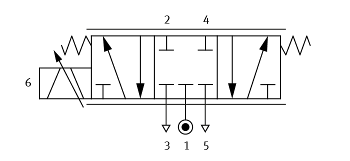 an den beiden Seiten des Steuerkolbens ein Kräftegleichgewicht – der Steuerkolben nimmt die mittlere Stellung ein. Der Druck für die Vorsteuerventile wird im Ventil vom Druckluftanschluss abgenommen.