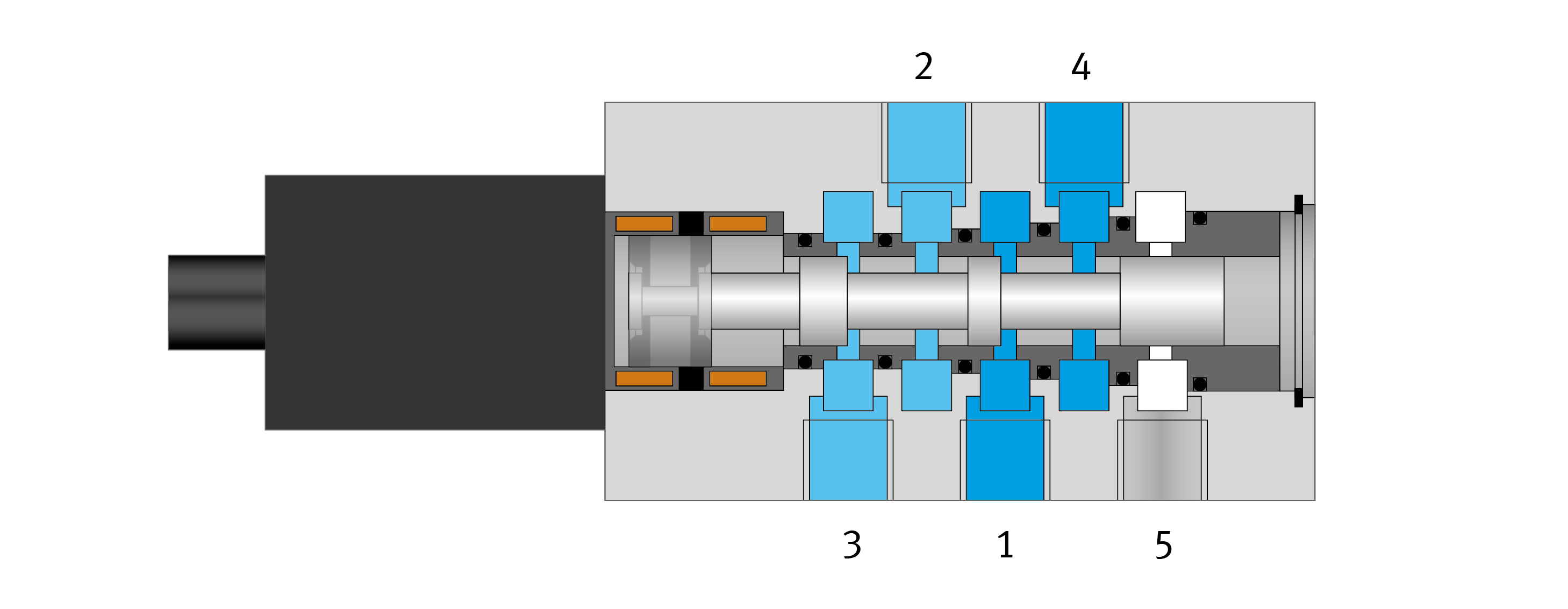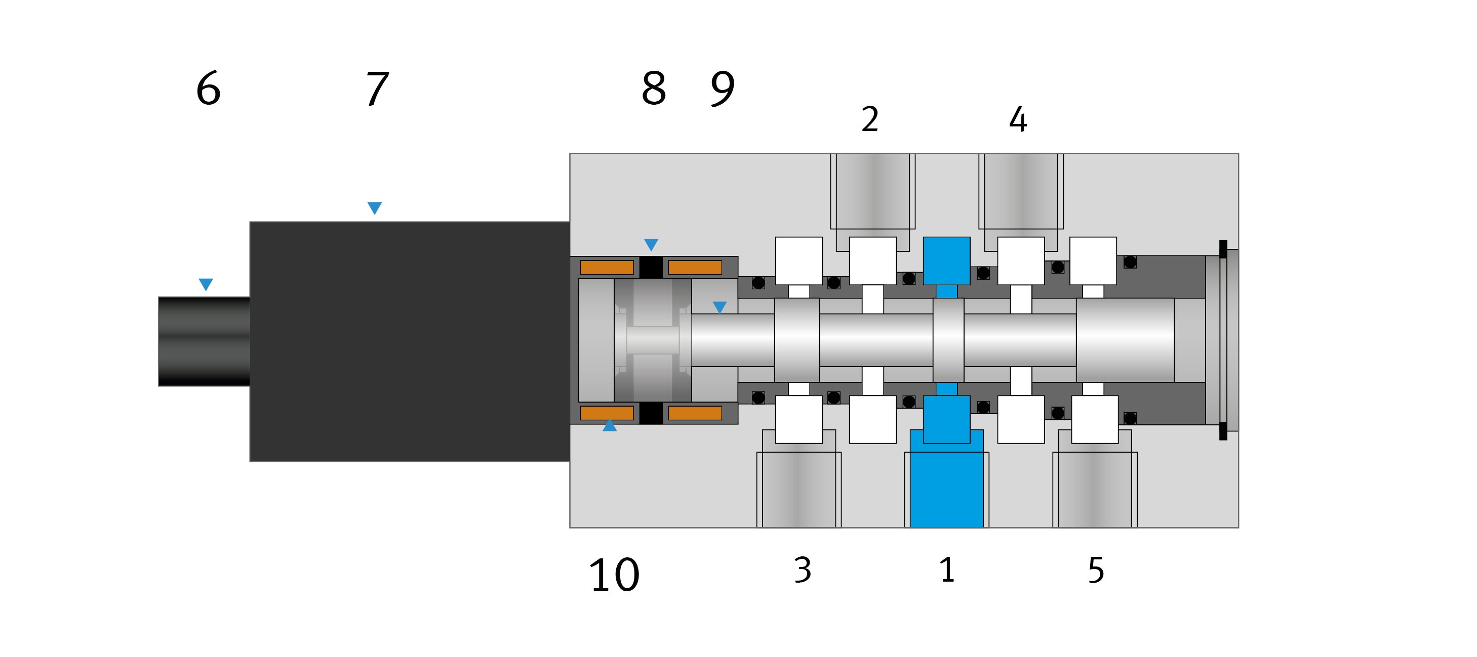 Das Betätigungselement zum Schalten der Arbeitsstellungen ist ein hubgesteuerter Proportionalmagnet.