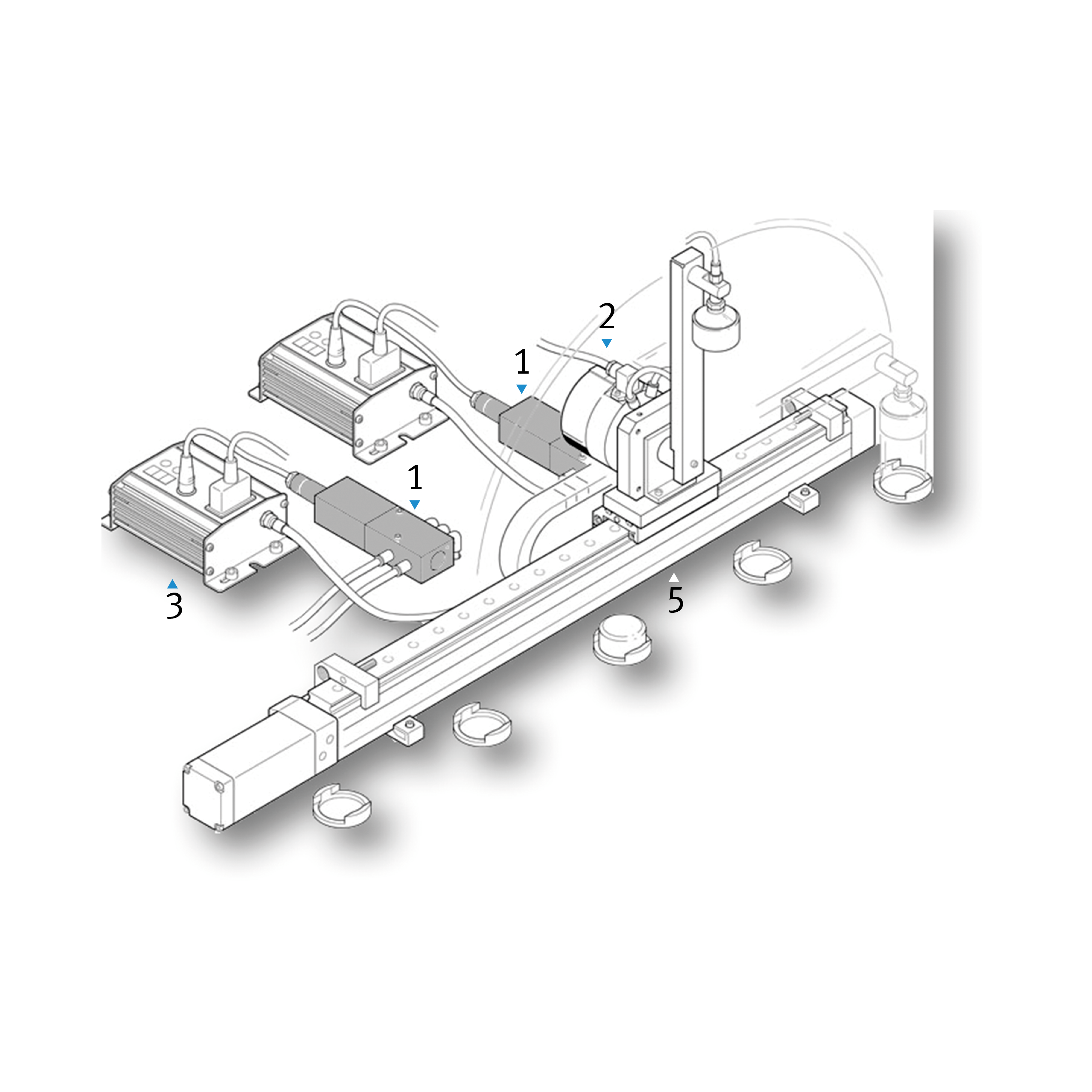 Eingesetzt werden die Proportional-Wegeventile beispielsweise zur Geschwindigkeitsregelung von Pneumatikzylindern. Die Abbildung auf der folgenden Seite zeigt eine Anwendung, bei der die Geschwindigkeit von Dreh- und Linearantrieb