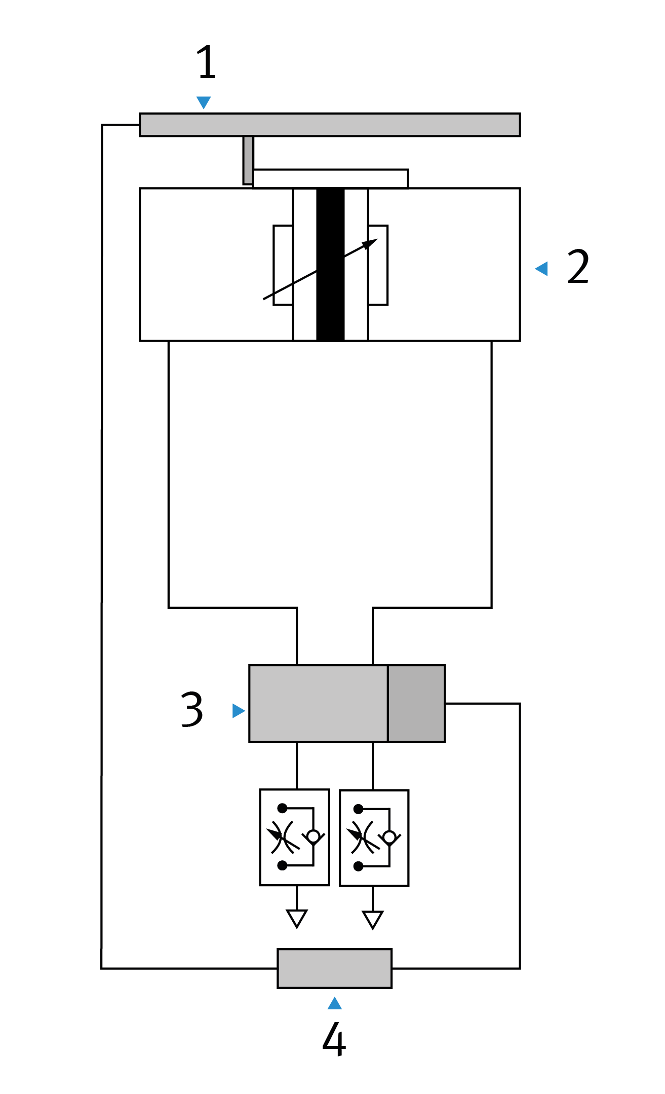 Die Vorsteuerung besteht aus den Vorsteuerventilen, einem Sensor und einer Auswerteelektronik.